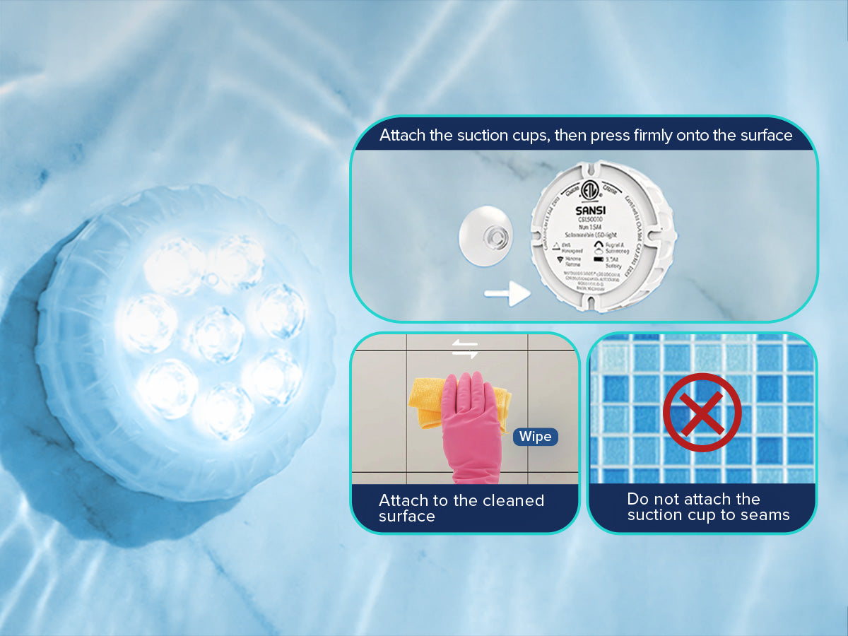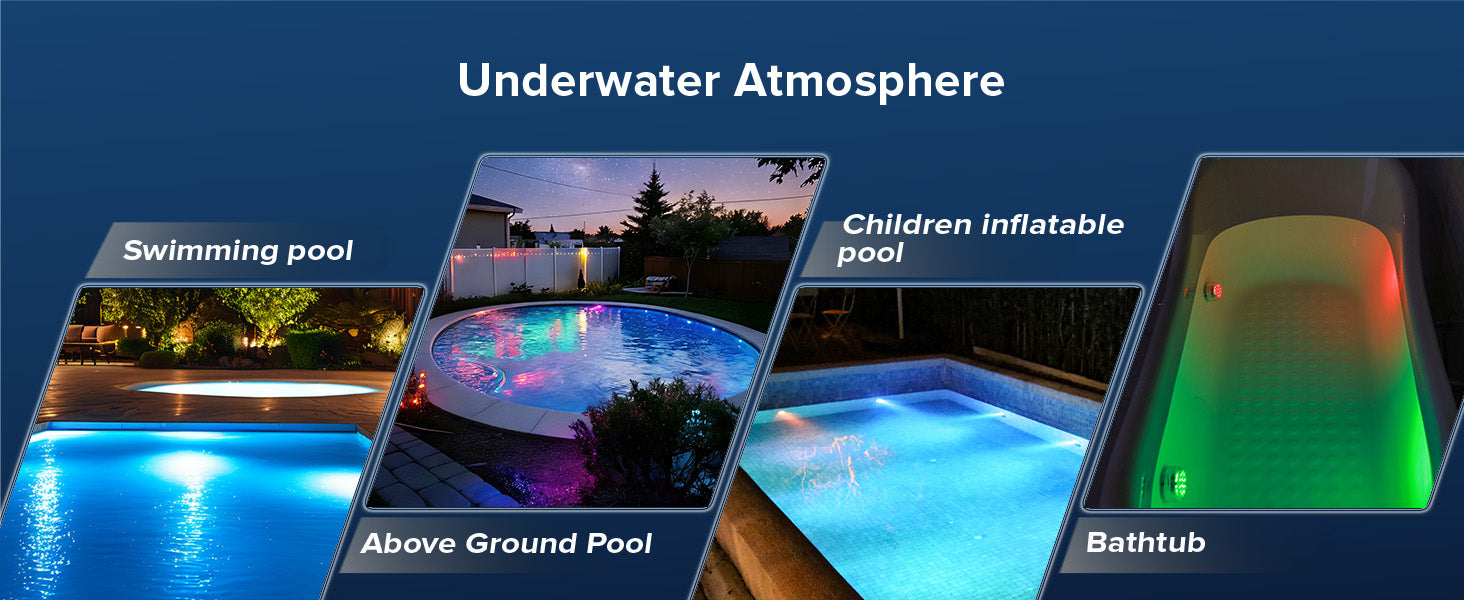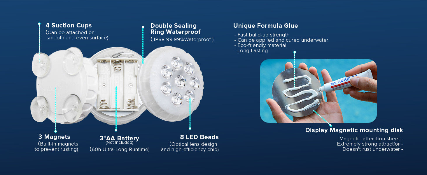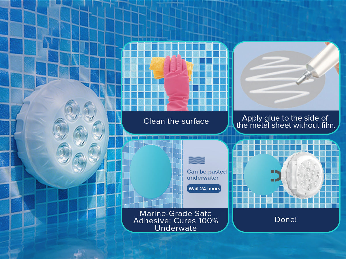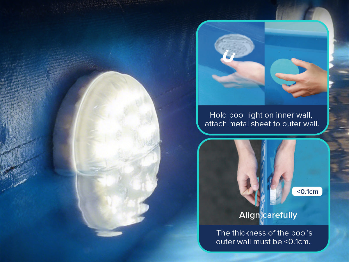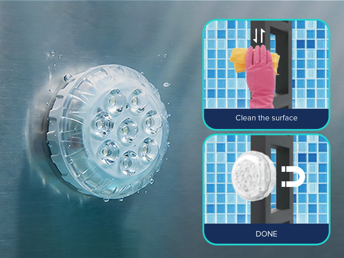 - EASY INSTALLATION & VARIOUS MOUNTING METHODS – Our pool light comes with a magnetic plate, suction cup, and strong adhesive for mounting on all surfaces: metal, tiles, inflatable pools, above-ground pools, and more.