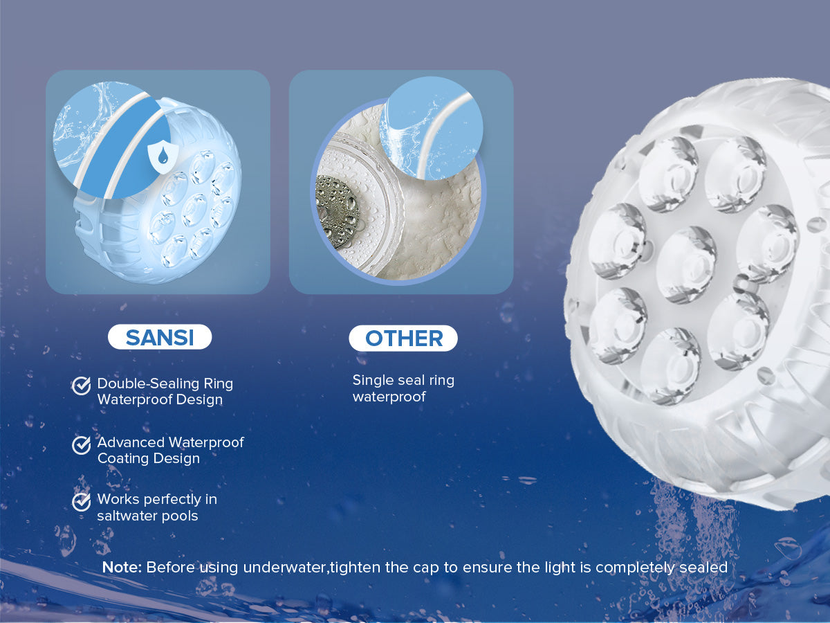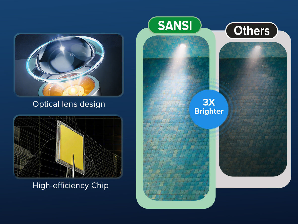 - SUPER BRIGHT & LONG-LASTING – The SANSI pool light uses 8 optical lenses and a specially developed, high-efficiency light source. As a result, it is 4 times brighter than conventional pool lights and offers an average illumination time of up to 60 hours.