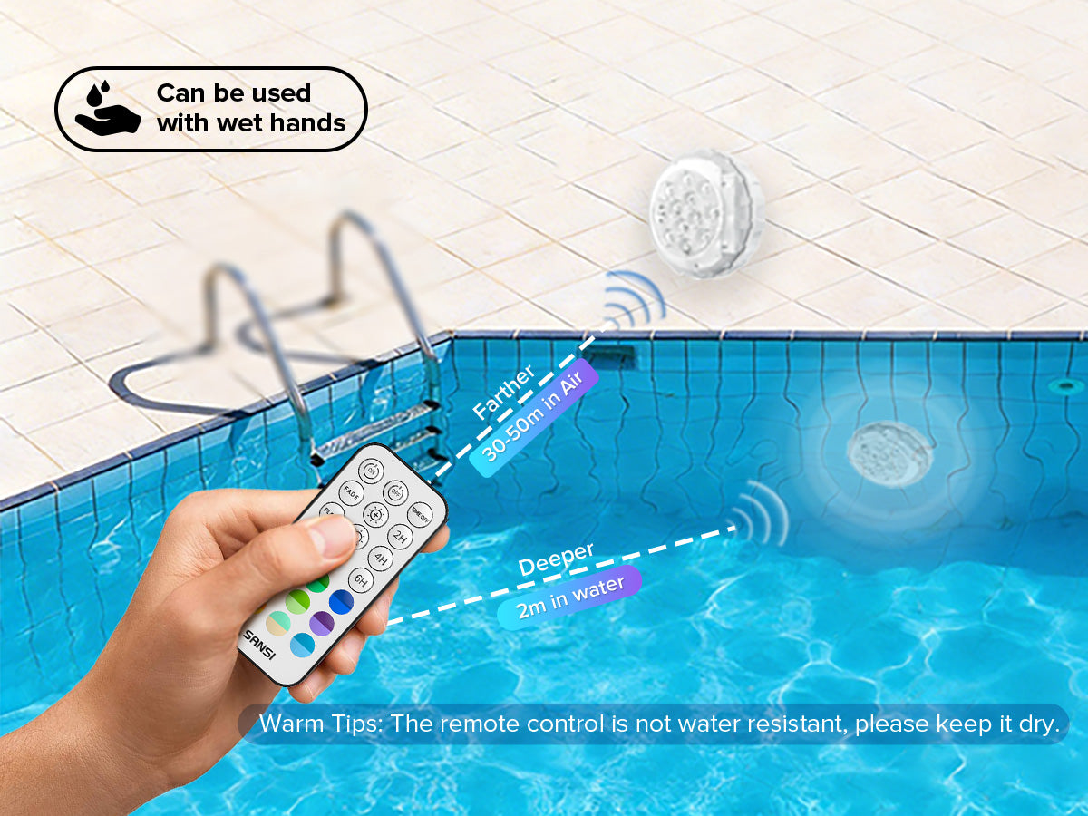 - WIRELESS REMOTE CONTROL & 20 COLOR MODES – You can control colors, brightness, and modes from up to 50 meters (in air) / 2 meters (underwater) away. It can also be operated with wet hands.