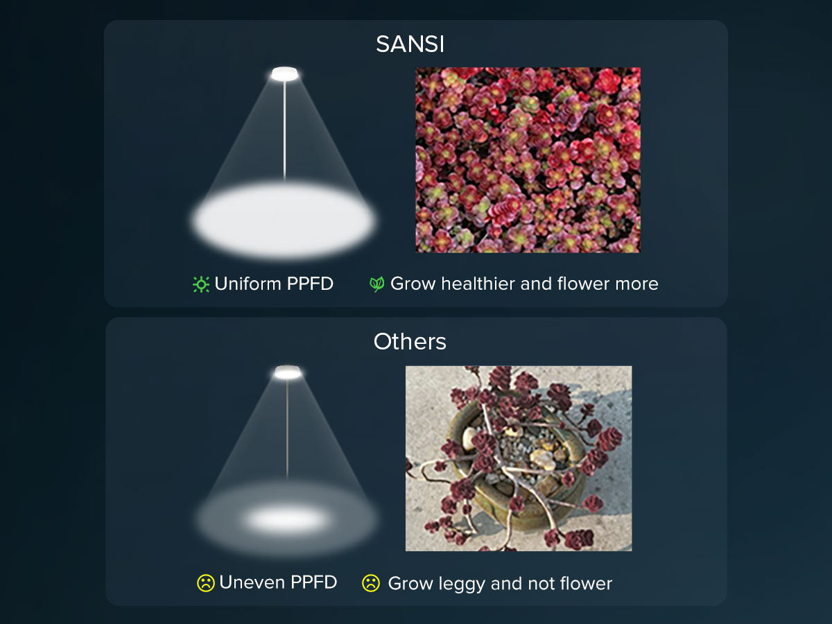 - UNIFORM GROWING LIGHTS: SANSI LED grow lights provide powerful and evenly distributed sun-like light, bringing plenty of light to your plants. Compared with the problem of uneven light distribution of other brands of grow lights, using Sansi grow lights will prevent your plants from leggy growth and make your plants grow healthier.