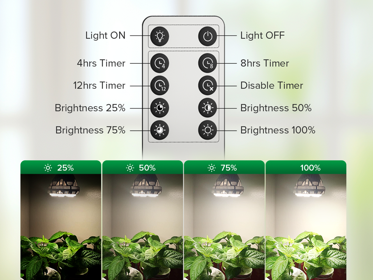 - 4000K DIMMING & TIMING: Remote Control Available - No need to unplug/re-plug! It is designed with a 4, 8, 12 timing function and offers 4 Dimming 4000K brightness levels from 25% to 50% to 75% to 100%. You don't need to move your plants or the light bulb, just use the remote control to chose the most suitable brightness for your plants growth.