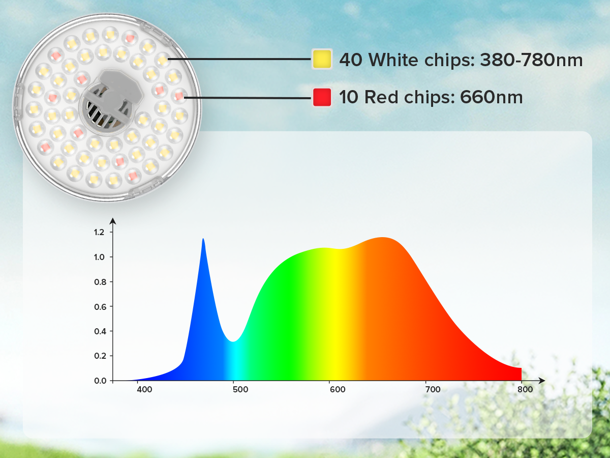 - Full Spectrum + 660NM Supplementary Light: Customized red and white full spectrum, realizes a more ideal full life cycle full spectrum supplementary light program, covering the entire visible spectrum of 380nm-780nm. And extra 660nm red supplementary light helps to flower and fruit and prolong flowering, increases production.