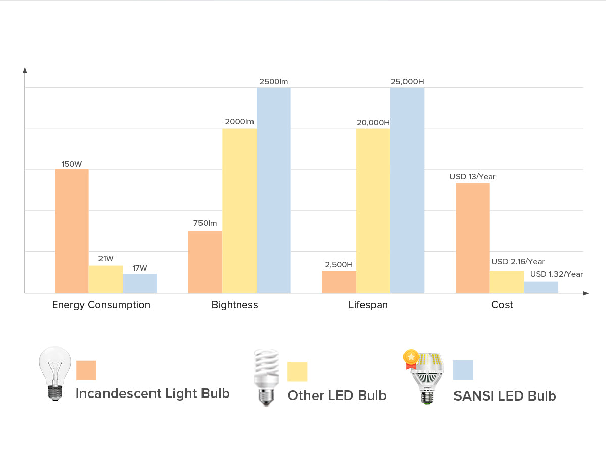 - BRIGHT & EFFICIENT: This is the upgraded version.Compared with other LED bulbs, SANSI's highly efficient light bulbs can provide 2500 lumens using only 17 watts of power, equivalent to 150W-200W incandescent bulbs. Based on 3 hours per day usage, save up to 90PCT electricity, annual estimated cost 1.86.