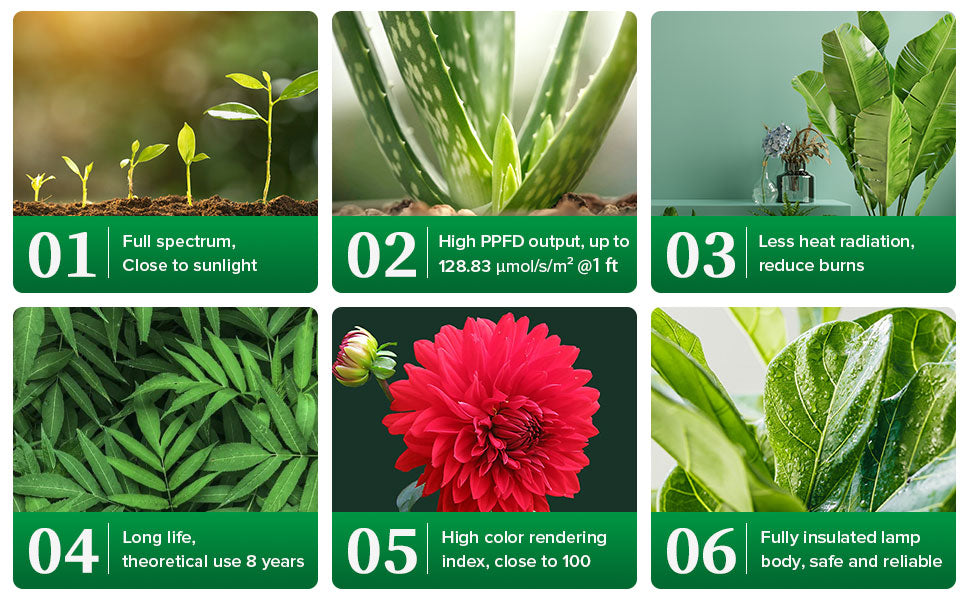 - Safe and reliable: The lamp body is made of special ceramic materials and the flame retardant level reaches V0; the design of a reinforced insulation structure without the risk of electric shock is safer. The shell materials all reach the corrosion protection level WF2, which is more reliable and durable. Low IR, less heat radiation, avoid burning plants in close contact.