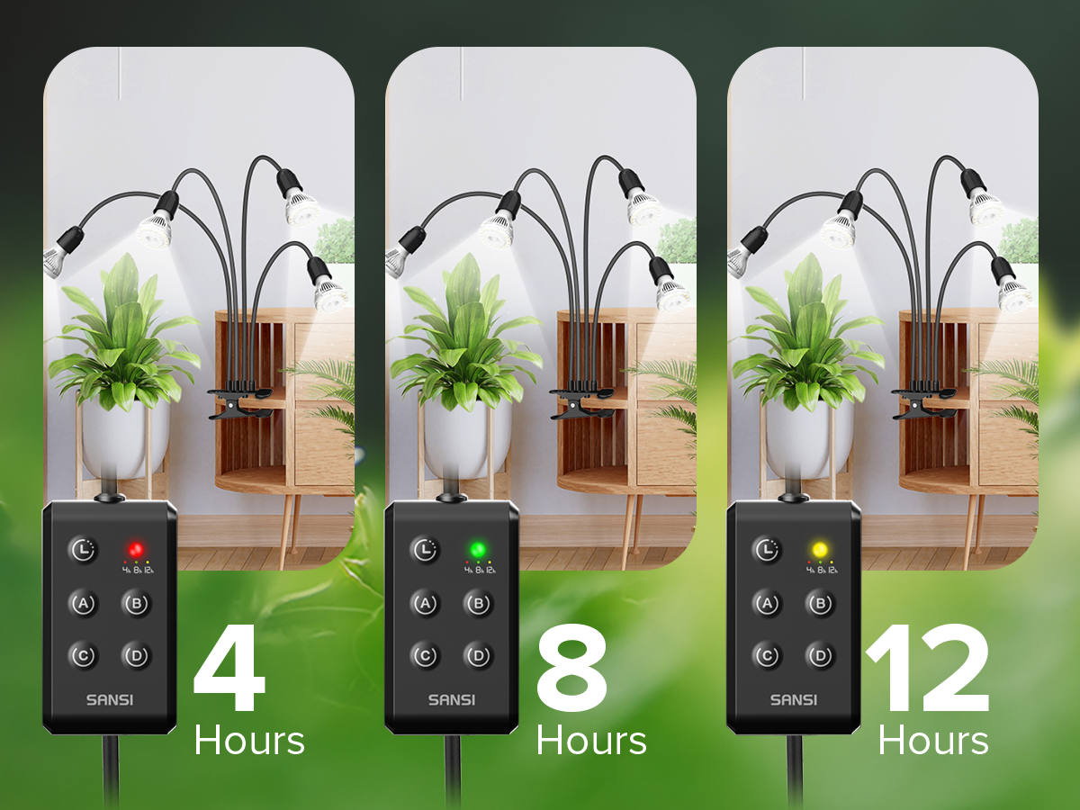 - AUTO ON/OFF TIMER: SANSI growing light offers an Auto on/off timer function with 3 options that are 4Hrs, 8Hrs and 12Hrs. It's based on a 24-hour cycle from when you set the timer. For example, when keeping power ON, if you select 8 Hrs, it will turn ON for 8 hours per 24 hours.