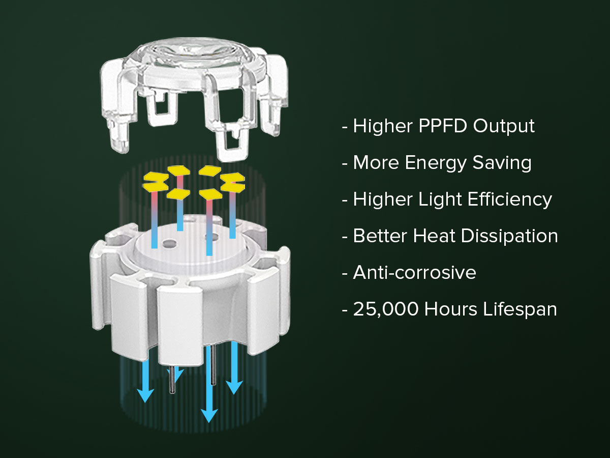 - SECONDARY OPTICAL DESIGN: PPF: 36.2umol/s, PPFD:177.06μmol/s/㎡@1FT: . Through the lens for secondary scientific light distribution, improve light utilization, give plants more supplementary light, and improve light bulb lifespan to 25,000 hours.