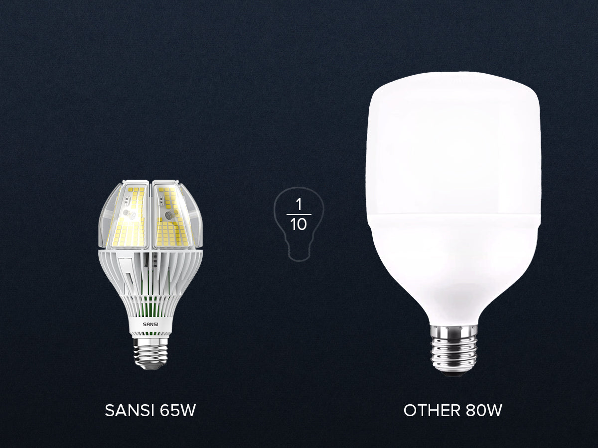 - Super Bright: SANSI's 10,000 lumens LED light bulb using only 65 watts of power, equivalent to 650W incandescent bulbs. Recently, it is the brightest LED bulb on the market. (Notice: SANSI A21 65W LED light bulb is in diameter (3.07 inch) larger than standard A21 size bulbs. Please check if the bulb size fits your light fixture before making a purchase.
