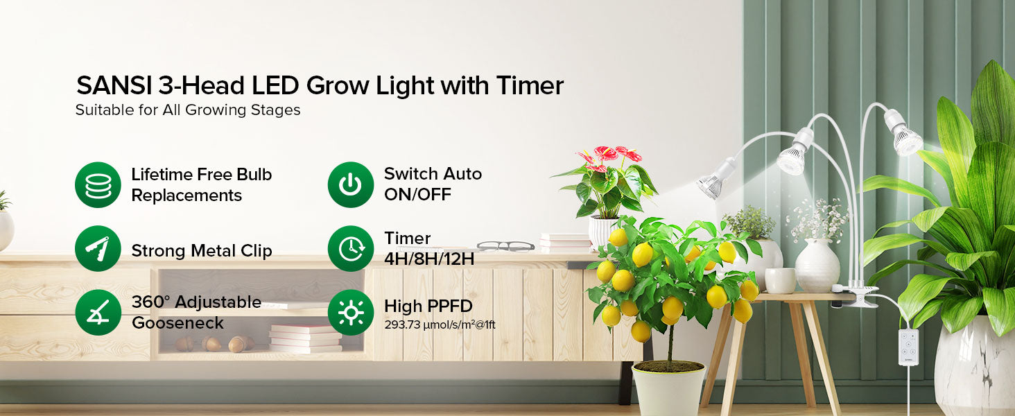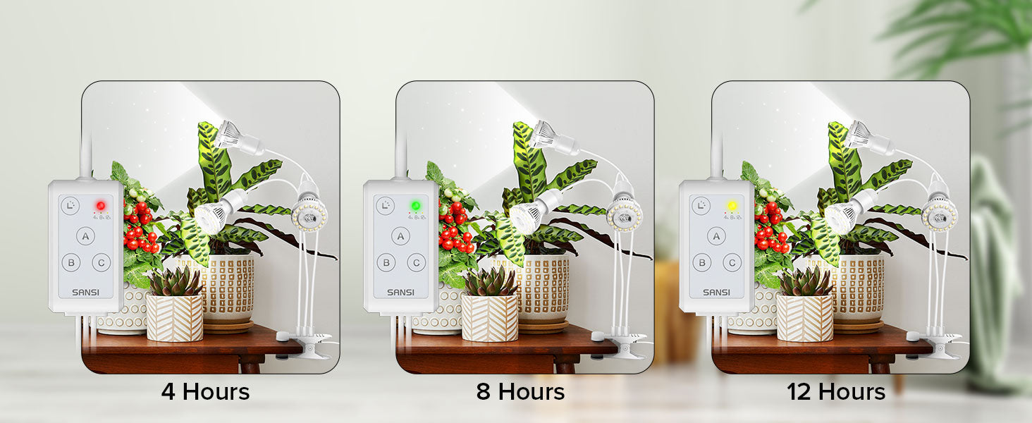 - AUTOMATISCHER EIN-/AUS-TIMER: Die SANSI Pflanzenlampe bietet eine automatische Ein-/Aus-Timerfunktion mit drei Optionen: 4 Std., 8 Std. und 12 Std. Sie basiert auf einem 24-Stunden-Zyklus ab dem Zeitpunkt der Timereinstellung. Wenn Sie beispielsweise bei eingeschaltetem Gerät 8 Std. auswählen, schaltet sich die Lampe 8 Stunden pro 24 Stunden ein.