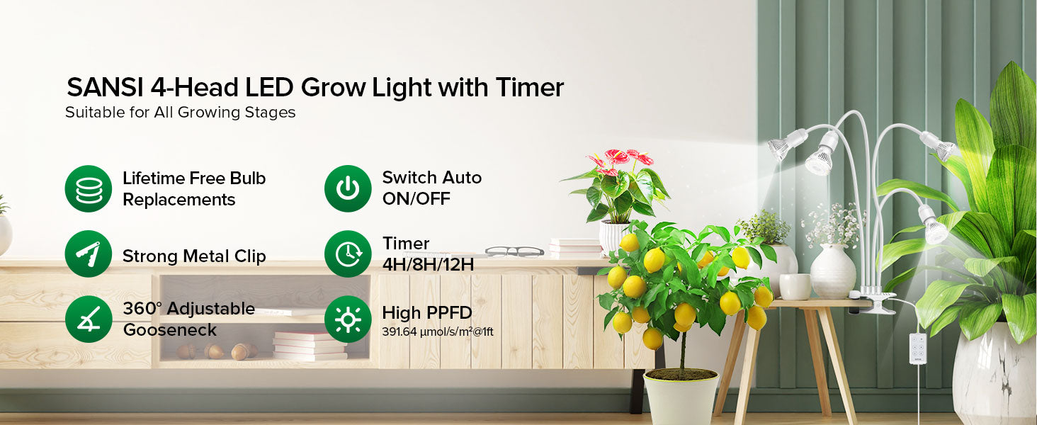 SANSI LED Plant Lamp for Indoor Plants, 600 W Full Spectrum 4 Gooseneck Clip On Plant Light with Timer 4/8/12 Hours, Growth Lamp with High PPFD, Lifetime Free Bulb Replacement, White.