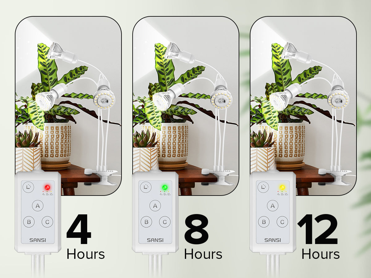 - Timer di accensione/spegnimento automatico: la lampada LED SANSI supporta una funzione di timer di accensione/spegnimento automatico con 3 opzioni: 4 ore, 8 ore e 12 ore. Si basa su un ciclo di 24 ore a partire dall'ora di impostazione del timer. Ad esempio, se si lascia accesa la lampada e si seleziona 8 ore, si accenderà ogni 24 ore per 8 ore.