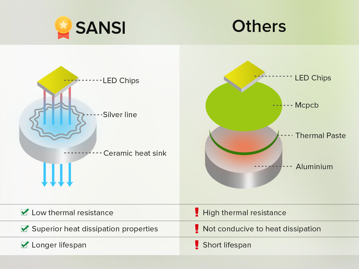 Adopted a non-conductive ceramic heat sink, and directly solder the LED chip on the ceramic, efectively reducing the thermal resistance between the LED PN junction and the surface of the heat sink,resulting in faster heat conduction and higher product reliability, producing a SANSl bub with higher light eficiency.