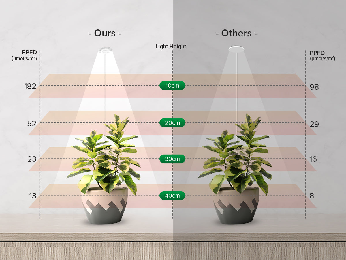 - Lampade per piccole piante luminose e con PPFD elevato: la potenza di uscita di 7 W sostituisce una lampadina generica da 25 W. Con un PPFD di 182 μmol/s/㎡ a 4 pollici, la lente fornisce una distribuzione scientifica della luce a due livelli, migliorando l'utilizzo della luce, garantendo una fotosintesi ottimale e promuovendo una crescita sana delle piante. Con una confortevole temperatura di colore di 4000 K e un angolo di fascio di 90°, si integra perfettamente in qualsiasi spazio, inclusi studi, uffici o fioriere a più piani.