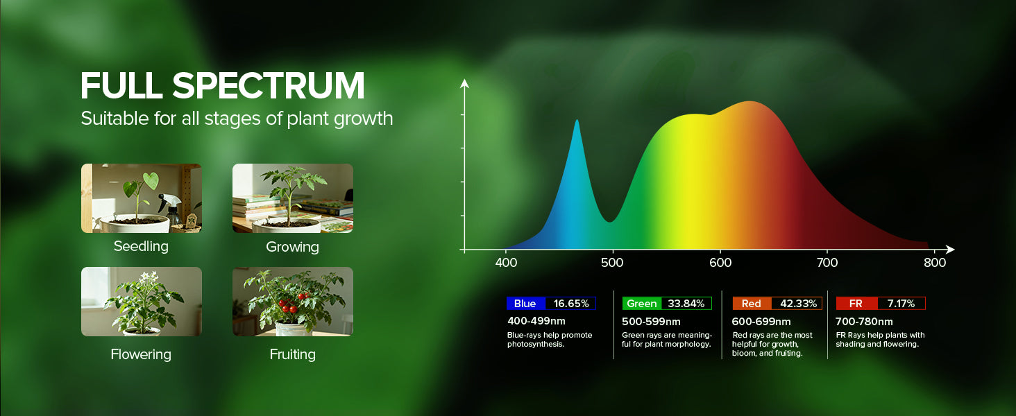 - Full Spectrum & High PPFD: This full-spectrum simulated sunlight wavelength meets the high-light requirements of tall broadleaf plants indoors, providing uniform illumination to the foliage layer and promoting thick, glossy leaves. Suitable for plants such as Bird of Paradise, Fiddle-Leaf Fig, and Monstera. High PPFD: 545.83umol/m²/s@1ft, this plant grow lights indoor provides 45W input power, designed for plant growth.