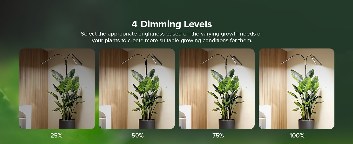 - 4-Level Dimming: This plant light features 4-level dimming functionality (25-50-75-100PCT), allowing you to precisely adjust brightness according to plant species and growth stage. For routine care, medium brightness (50PCT to 75PCT) is recommended, while plants requiring intense light should be set to 100PCT. The 4000K light closely mimics natural outdoor sunlight, maximizing photosynthesis while providing gentle, non-irritating illumination. A single lamp meets diverse lighting needs, making plant care more flexible and scientifically sound.