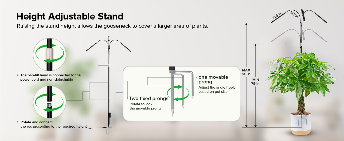 - 79"-90" Height Adjustable for Large Plants: This grow lights for indoor plants features a height-adjustable stand ranging from 79 to 90 inches. You can easily adjust the height by rotating the metal ring on the stand to maintain the optimal lighting distance between the light source and your plants. Ideal for tall tropical plants (like bird of paradise) and mature foliage plants, it eliminates the need to replace the light source as plants grow, ensuring ample light at every stage to promote robust growth.