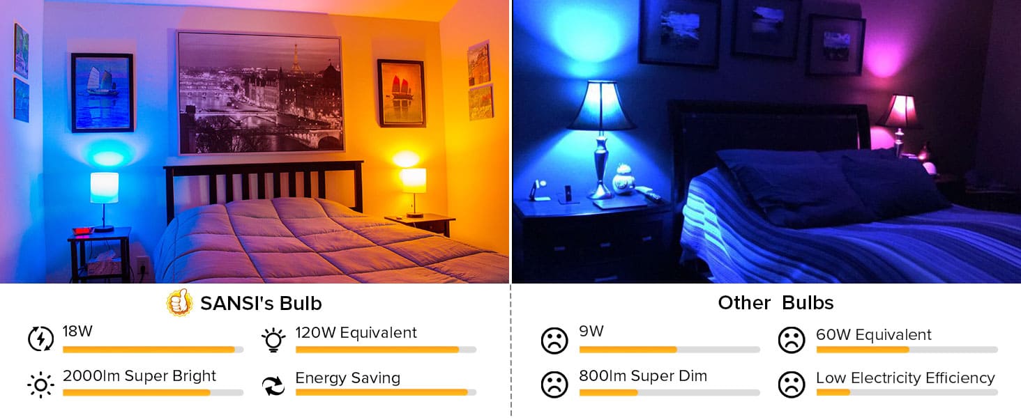 - SUPER BRIGHT & DIMMABLE: Compared with other LED bulbs, SANSI's colored light bulb can provide 1800 lumens using only 18W of power, equivalent to 120W incandescent bulbs, save up to 90% electricity. 4-level brightness adjustment can meet the needs of customers in various scenarios.