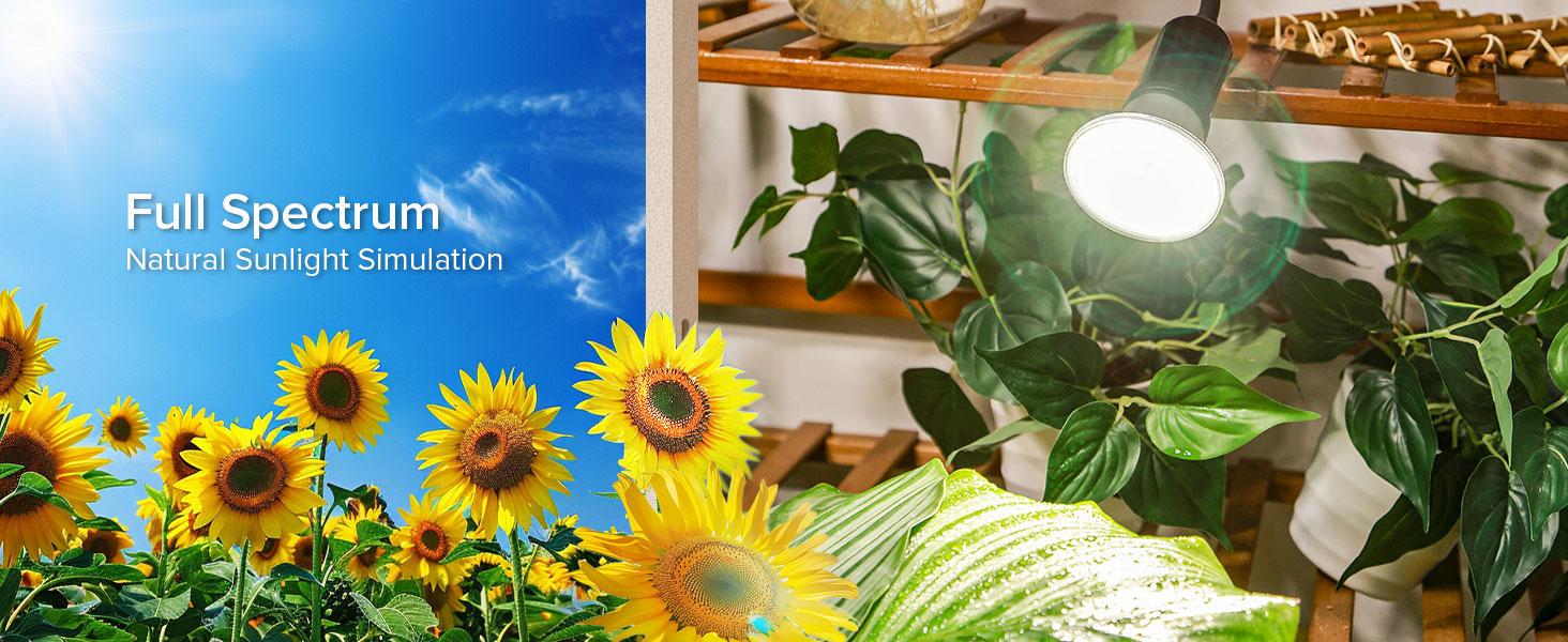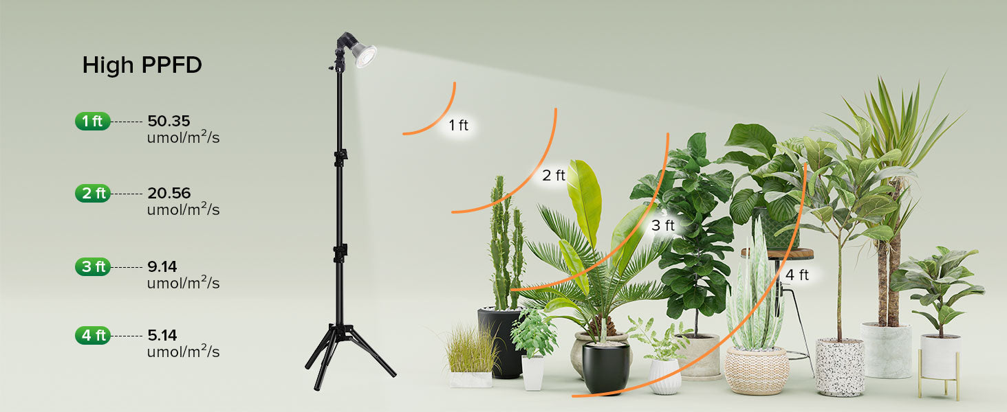 Full spectrum + 660nm additional light: Individually adapted red and white full spectrum from 400nm to 780nm, to achieve a more ideal full spectrum additional light solution for the entire life cycle. Red light promotes flowering and fruiting, prolongs flowering time, and increases yield. EU E27 version provides MaX PPFD 50.35μmol/s/㎡@1ft. US E26 version provides PPFD 60.42 μmol/s/㎡ @ 1ft, providing more supplementary light for plants.