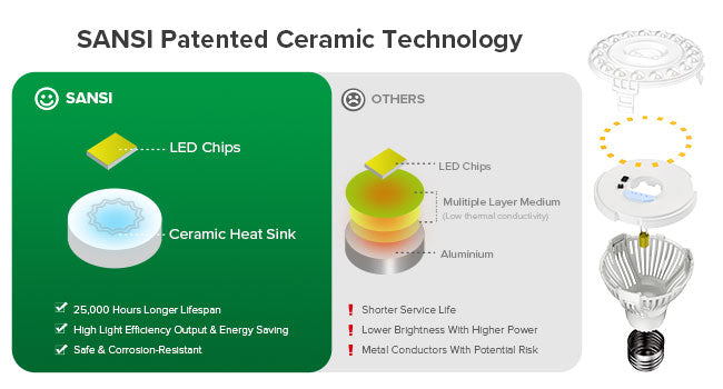 - COC Patened Technology: Unlike other brands' plant lights that rely on the plastic or aluminium heat sinks, SANSI welds the led chips on the ceramic, adopts the features of the ceramic material and unique hollowed-out structure to improve heat dissipation efficiency, prolonging the bulb’s lifetime to 25,000 hrs.