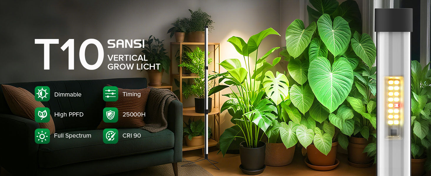 SANSI Vertical Grow Light, T10 Standing Grow Light for Indoor Plants, 55W 144 LEDs Full Spectrum Plant Light 4.34FT Adjustable Three-Stage, 5 Dimming, 4000K, Timer 3/6/12h for Wide Coverage Growth.