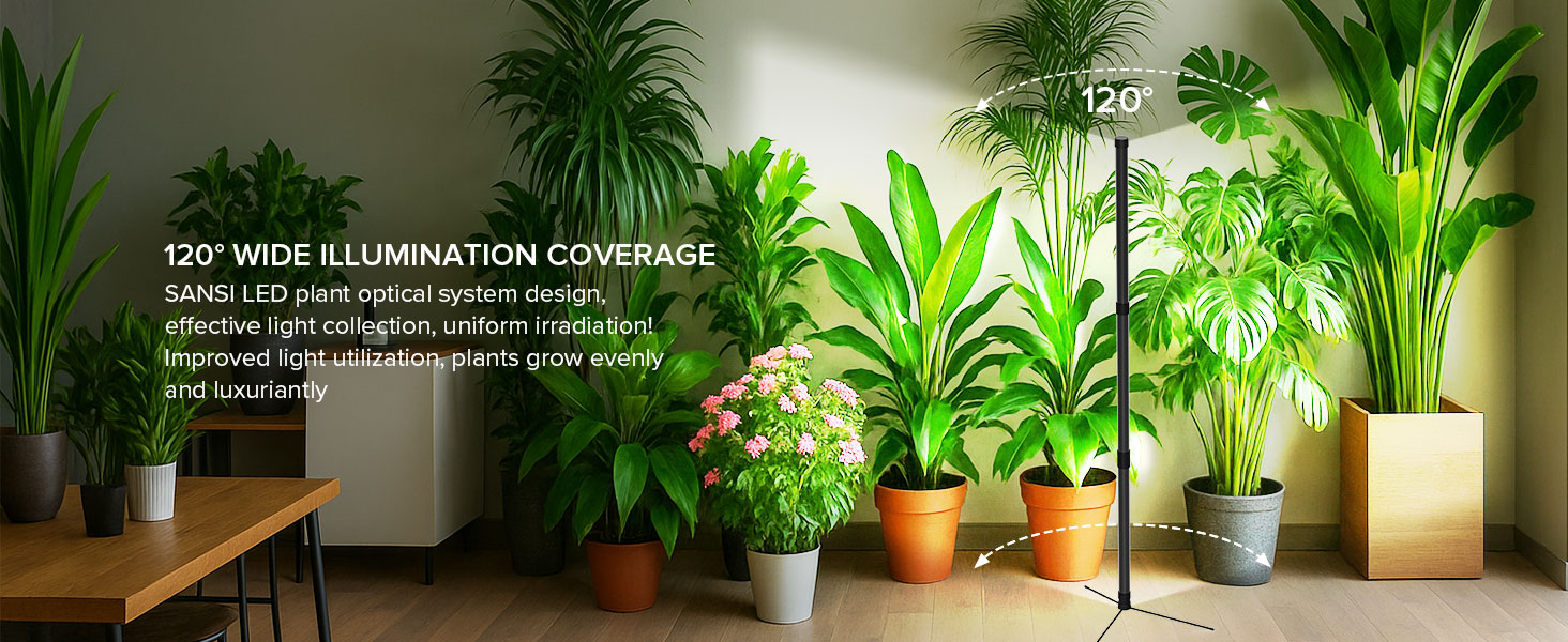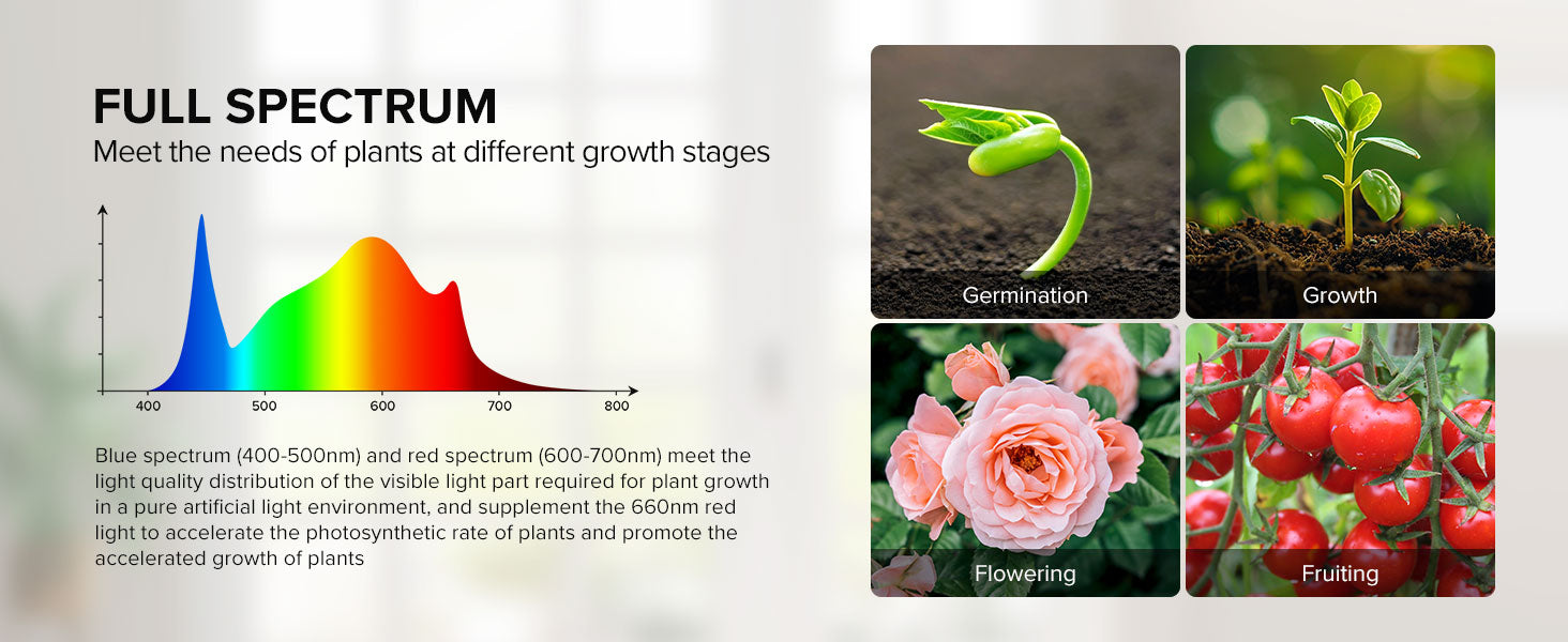 - Full Spectrum: This grow lights for indoor plants features 144 patented SANSI LEDs, boasting a high growing power of 255 μmol/s/㎡ (8 inches), a color temperature of 4000K, and a color rendering index (CRI) of 90. It closely replicates natural light conditions and covers the spectrum required for plant photosynthesis. It promotes flowering and fruiting, enhances chlorophyll synthesis, and provides balanced light, meeting the needs of plants from seedlings to mature plants.