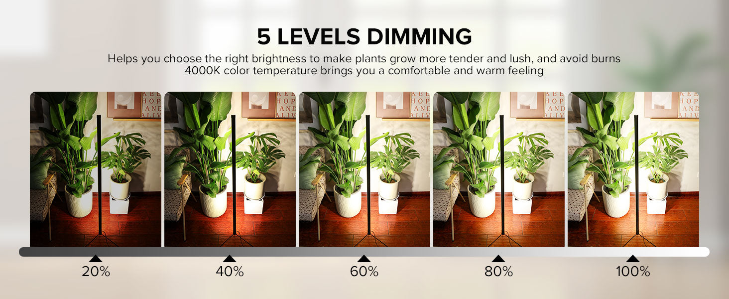 - Five-Level Dimming: This vertical grow light features five levels of dimming (20-40-60-80-100brightness, adjustable in 20PCT increments), allowing for easy adjustment based on plant needs. This provides flexibility and precision, meeting the diverse needs of tall plants and large plant stands and walls.