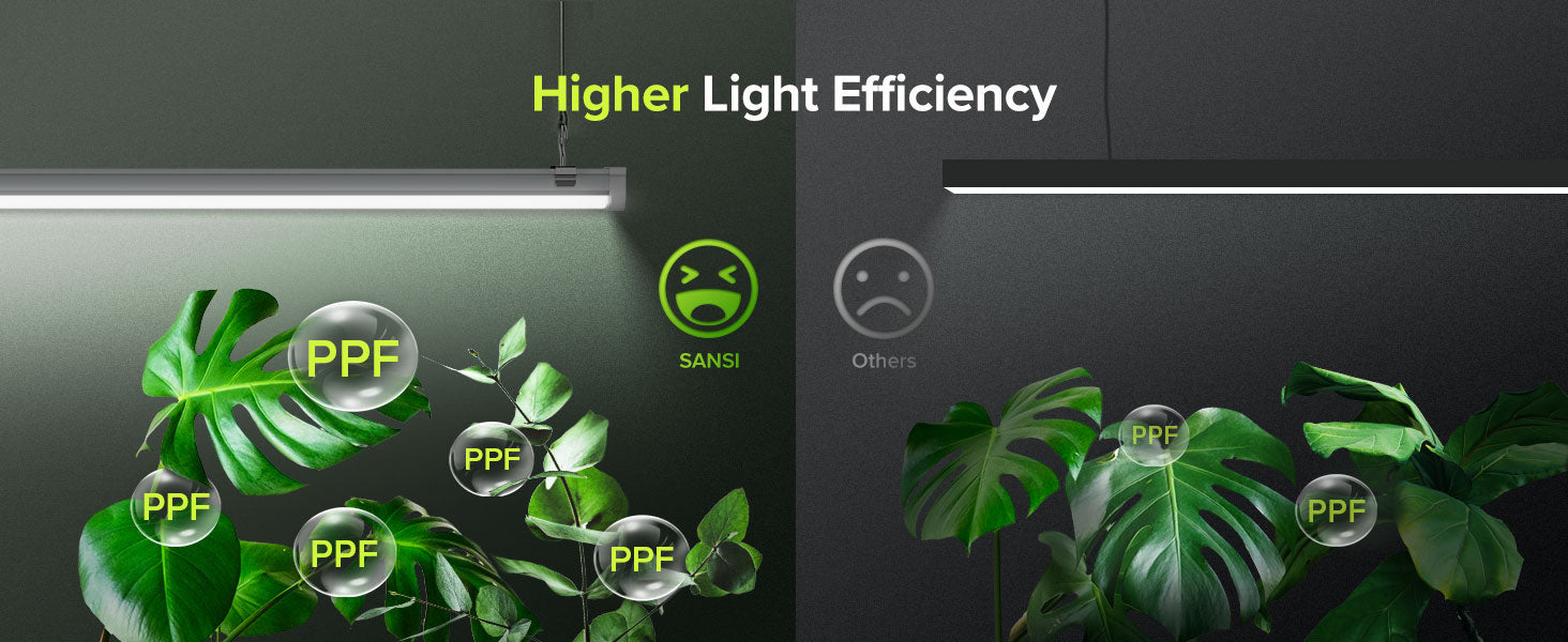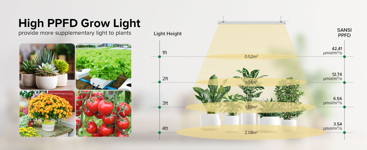 - HIGH EFFICIENCY & ENERGY SAVING: PPF:40umol/s, PPFD: 42.41umol/m²/s@1ft. The grow light provides 25W output power(180W Equivalent) with 2400lm, service life can reach 25,000 hours. The lamp body has a IP54 waterproof structure, there is no need to worry about water droplets splashing on the lamp when watering.
