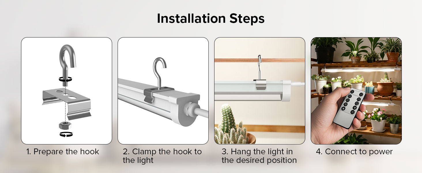 - EASY TO INSTALL: The package contains all the accessories needed for installation and can be flexibly installed for different places. Ideal for indoor use on plant shelves, cabinets, walls, greenhouse, and other places in the home/office space. The power cord is 5.24ft long, which is quite enough for indoor use.
